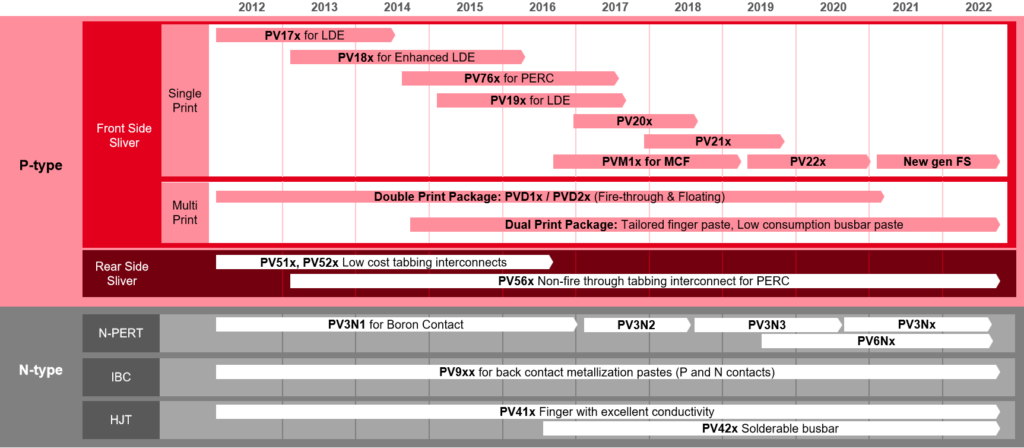 Muster anfordernSolamet® is the industry innovation leader in delivering metallization solutions enabling high efficiency cell technologies, including p-BSF, p-PERC, n-PERT/TOPCon, n-HJT, IBC and thin-film solar cells, introducing more than 110 new Solamet® PV metallization paste formulations over the last ten years, and continuing to develop new Solamet® pastes to boost solar cell efficiencies even more. Solamet® photovoltaic (PV) metallization pastes are advanced solar cell materials that deliver significantly higher efficiency and greater power output for solar panels. When screen printed onto the surface of solar cells, metallization pastes collect the electricity produced by the cells and transport it out.