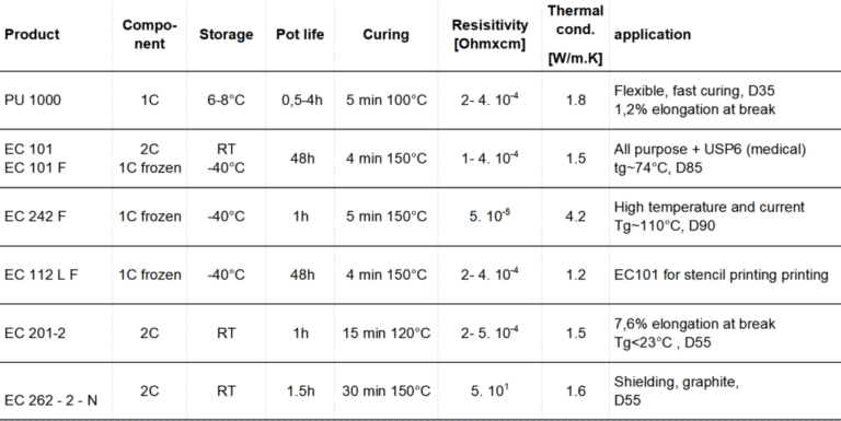 The following overview shows a number of innovative products including such ones which can be cured at room temperature and/or are characterized by excellent flexibility, together with proven standard conductive adhesives.